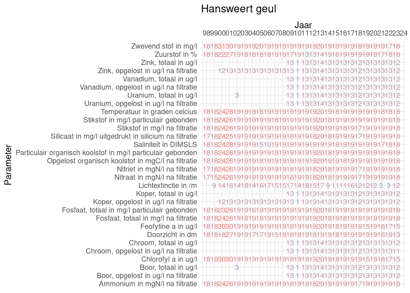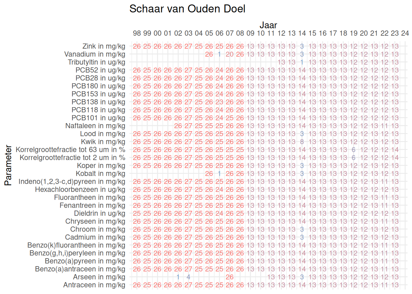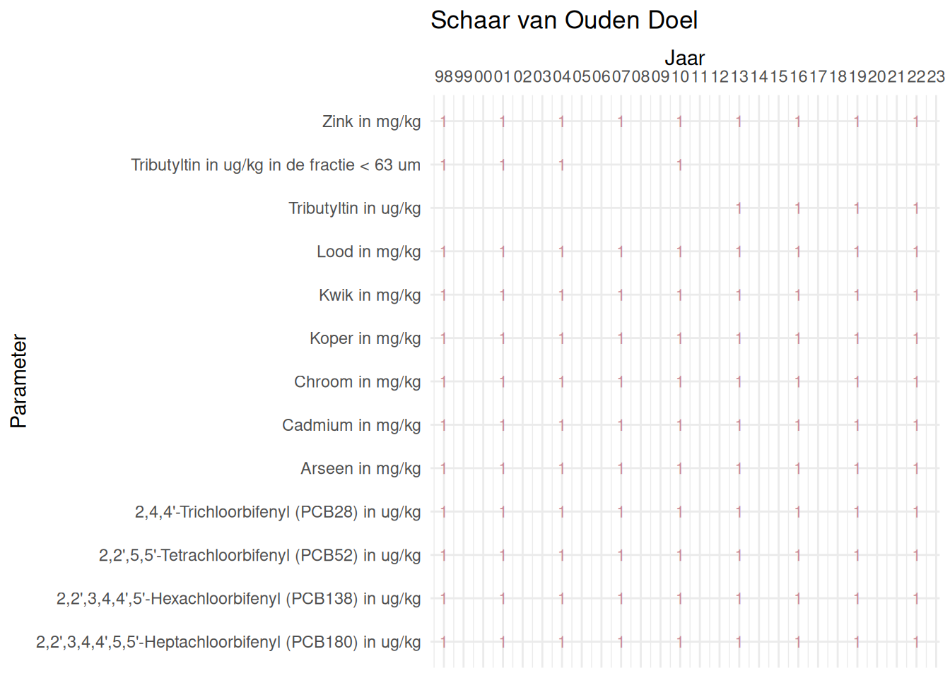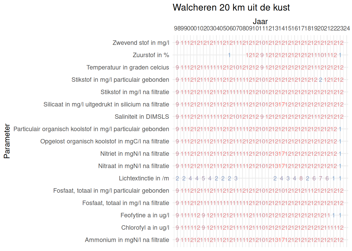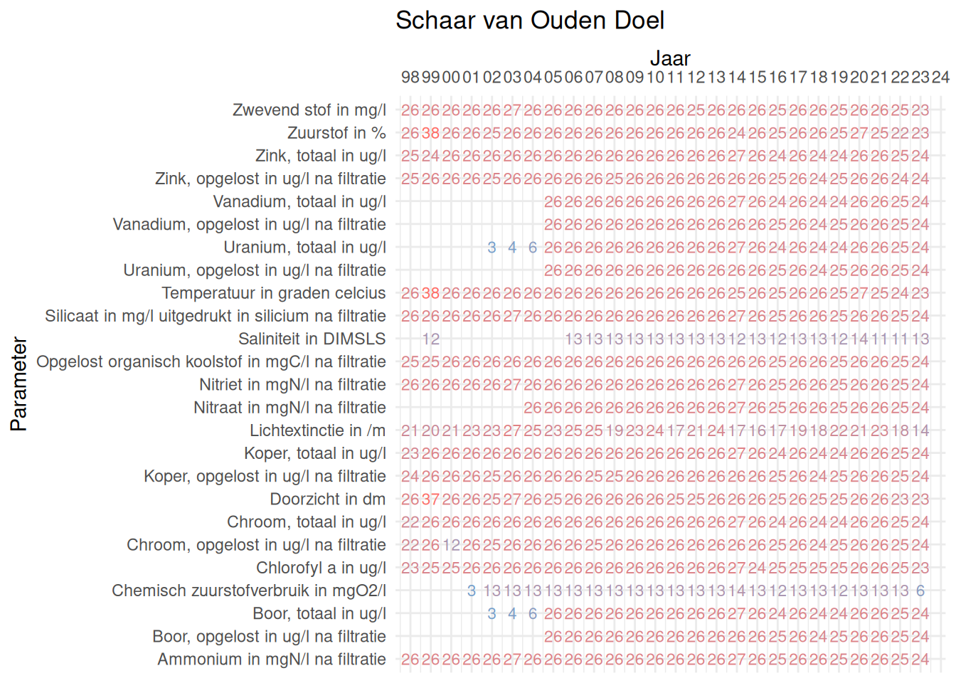 De meetdichtheidsmatrices geven voor ieder jaar aan hoe vaak elke parameter is gemeten.