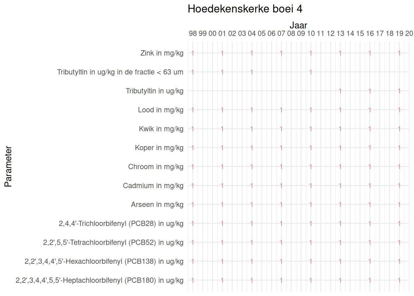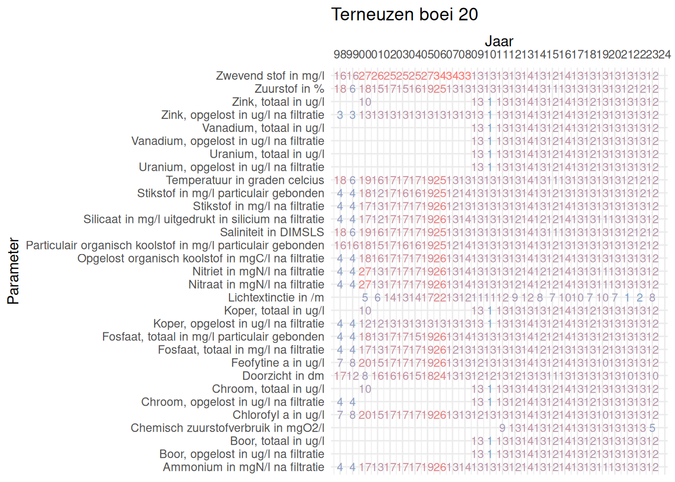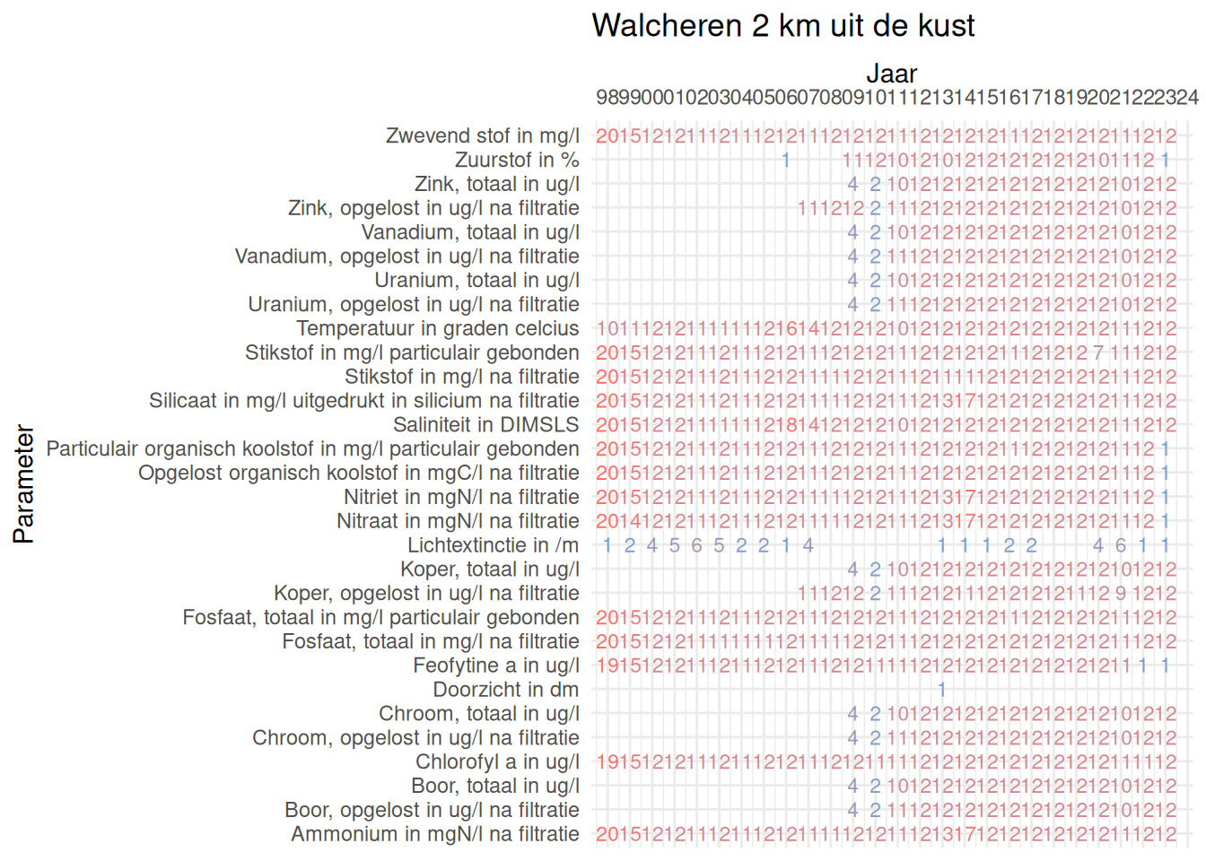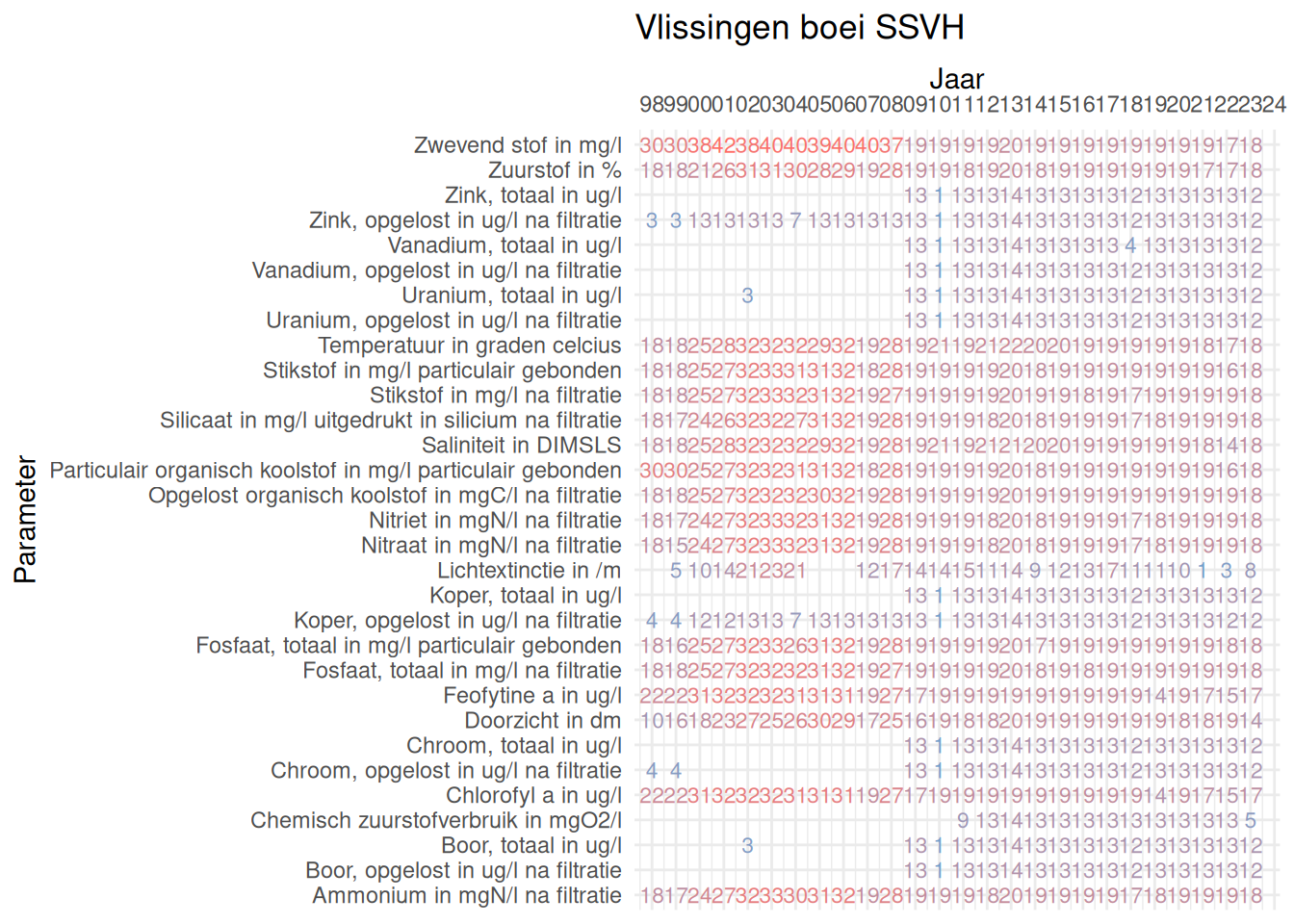 De meetdichtheidsmatrices geven voor ieder jaar aan hoe vaak elke parameter is gemeten.