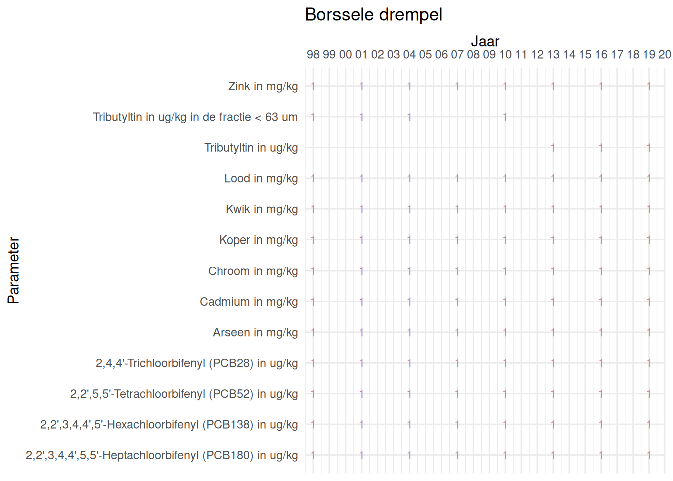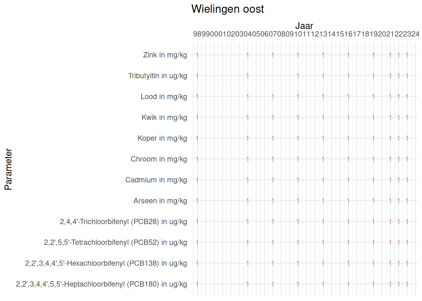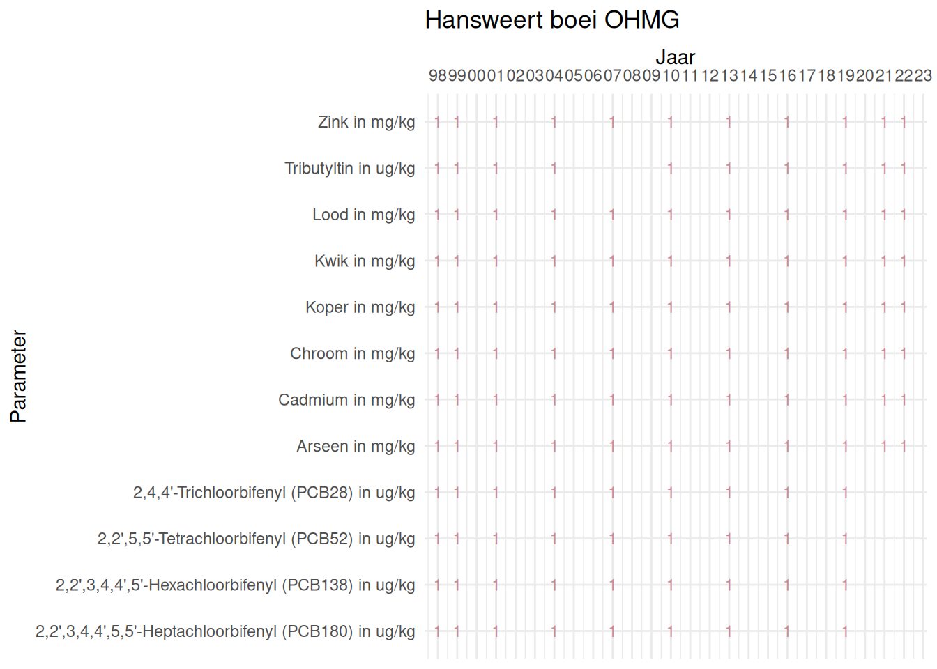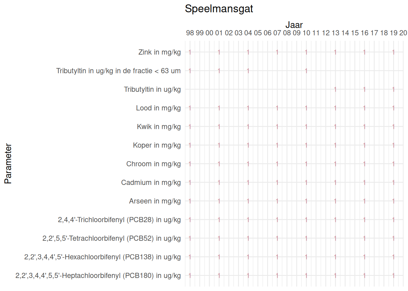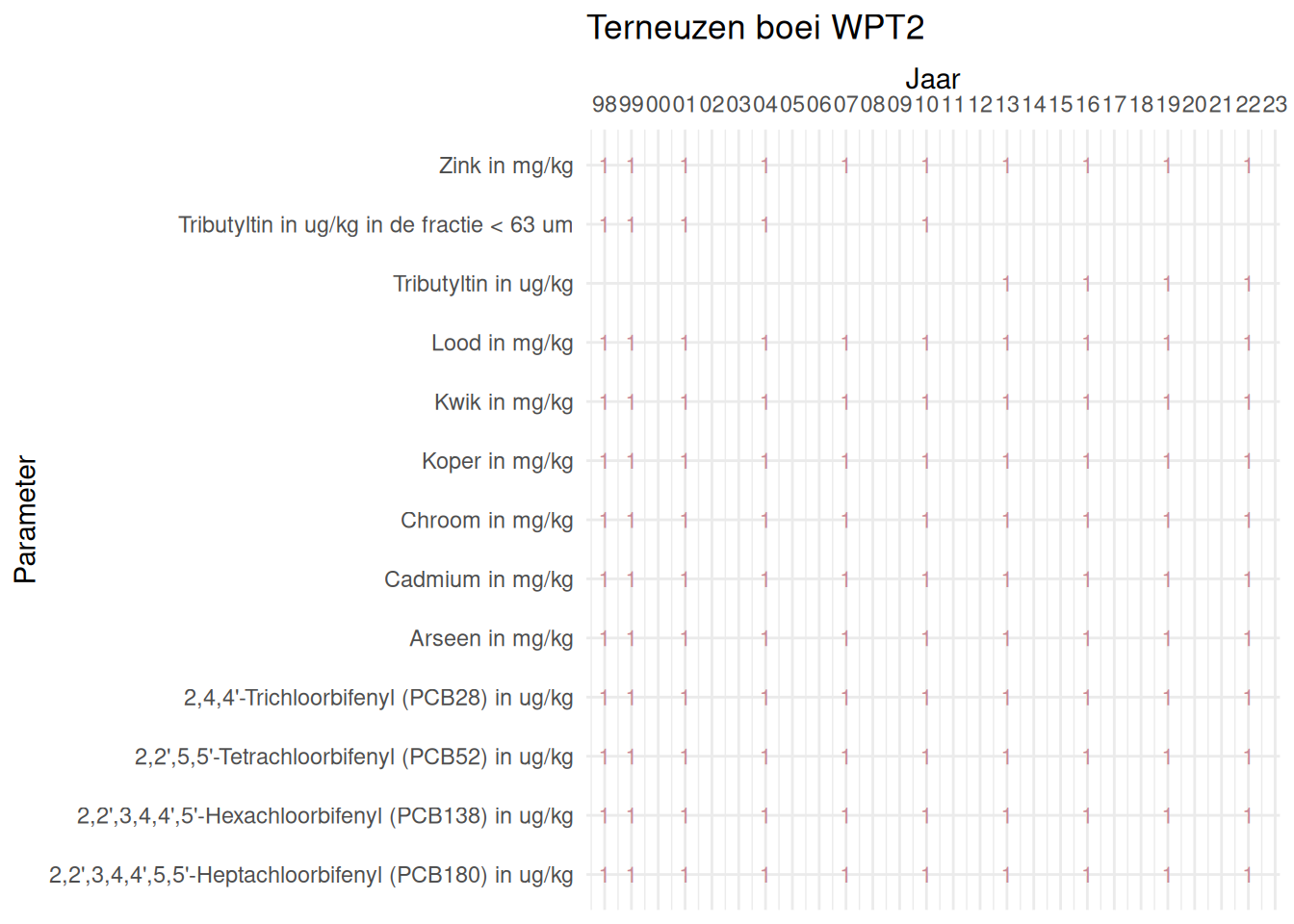De meetdichtheidsmatrices geven voor ieder jaar aan hoe vaak elke parameter is gemeten.