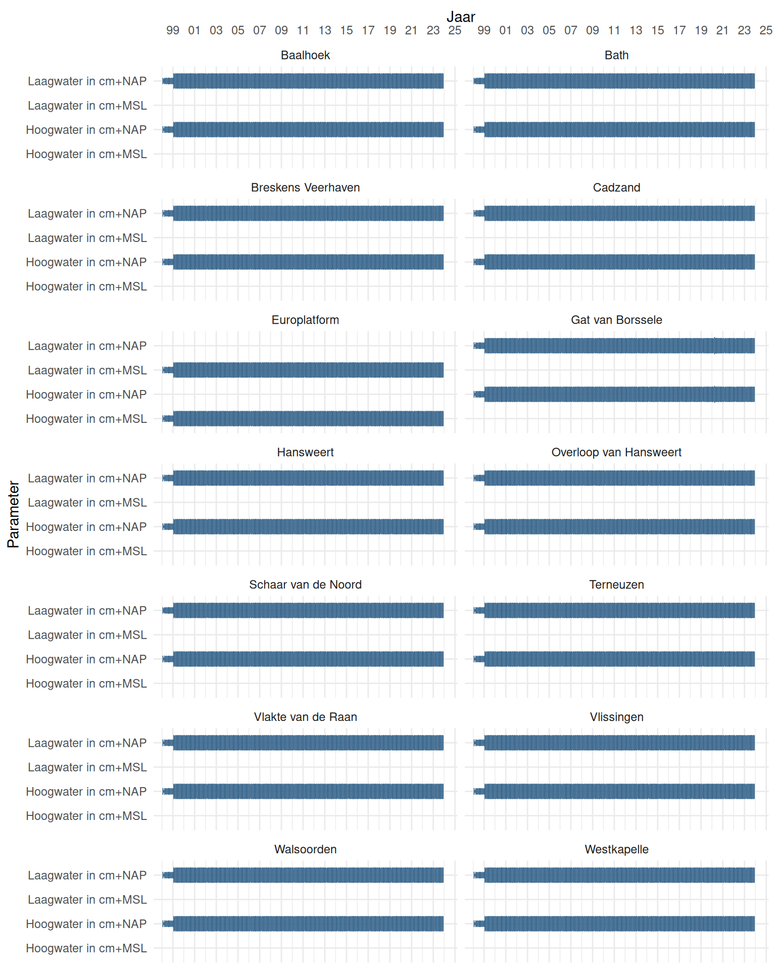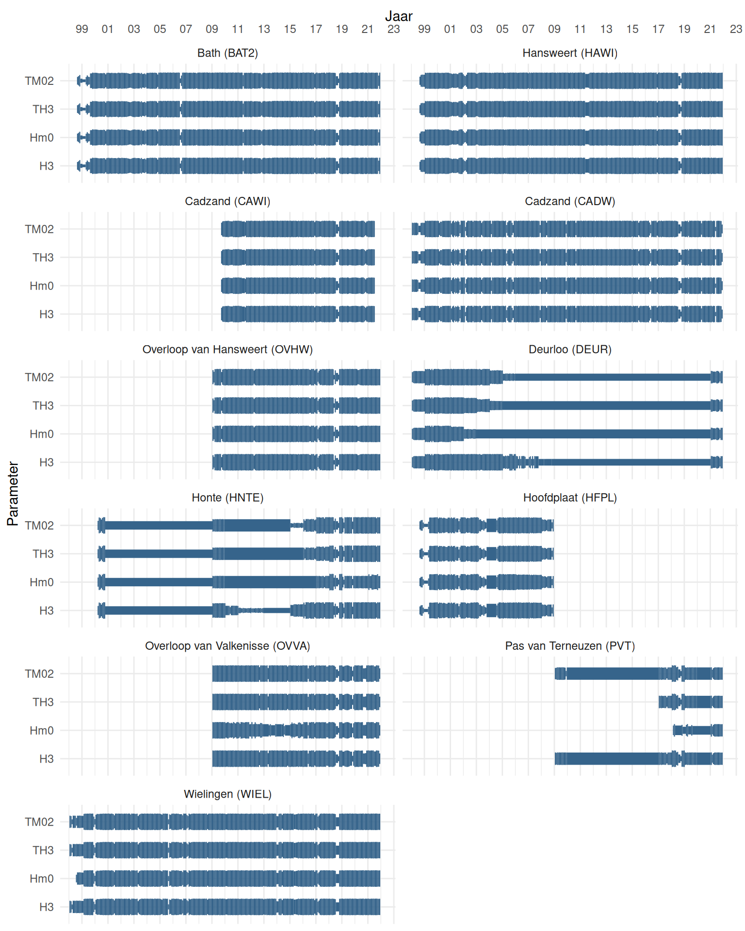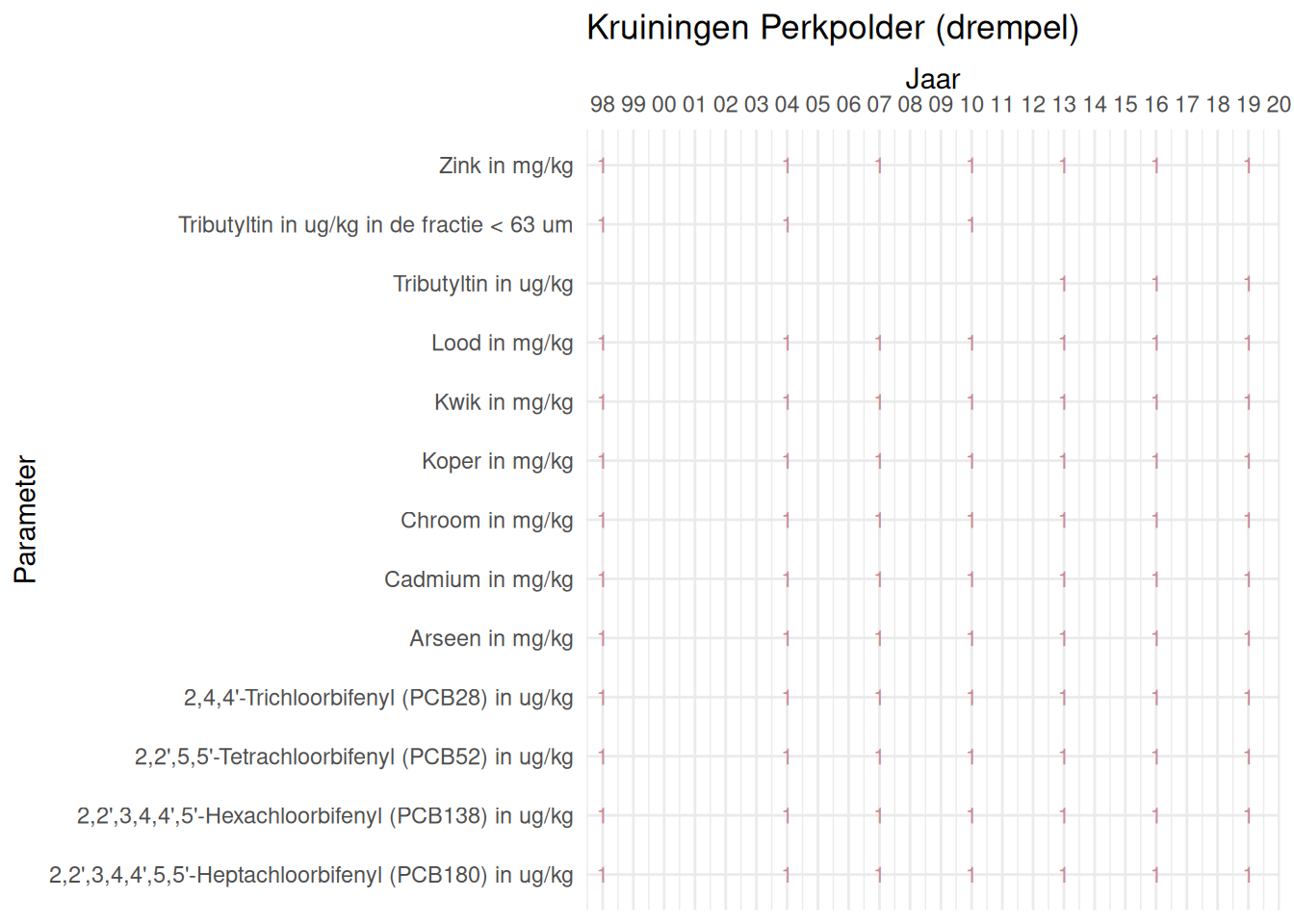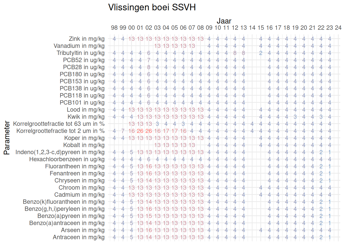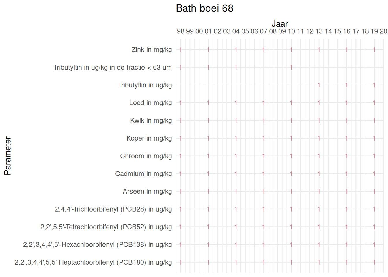 De meetdichtheidsmatrices geven voor ieder jaar aan hoe vaak elke parameter is gemeten.